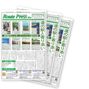 道の駅のフリーペーパー「ルートプレス」は、NPO法人人と道研究会が平成17年に創刊しました。原則季刊で、道の駅とその周辺地域における人と道に関わるさまざまなニュースや話題、観光情報等を分かりやすく的確にお伝えする道の駅の新聞です。