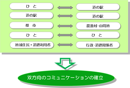 このために「道の駅」を基点として、「人」と「道の駅」、「道の駅」と「道の駅」、「都市」と「農漁村・中山間地」など、交流の原点である「道」の機能を探求し、都市住民と地域住民との連帯・連携を図る活動を支援する情報提供に努めます。